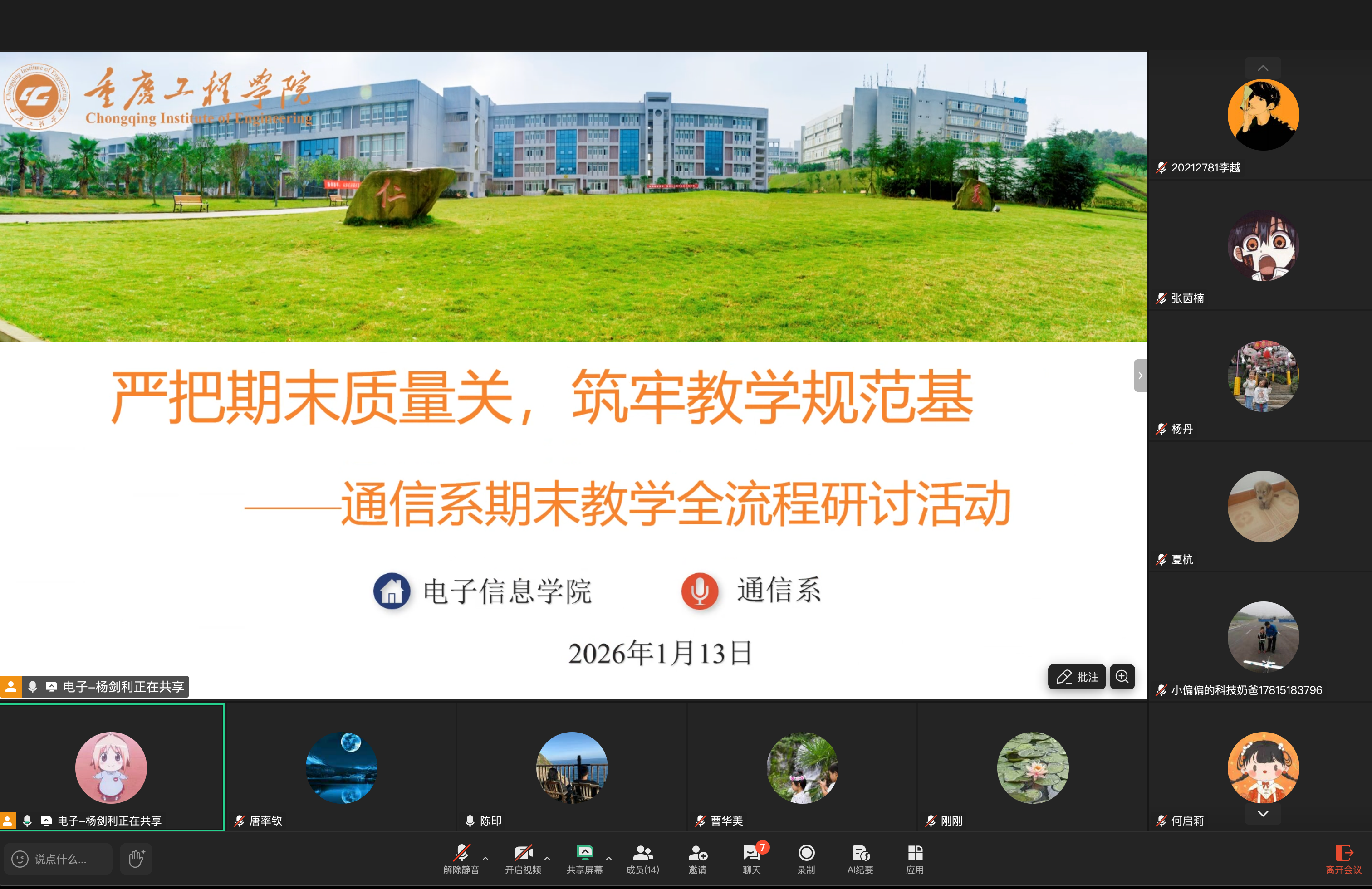 2026年1月13日,电子信息学院通信系通过线上会议组织开展了以“严把期末质量关,筑牢教学规范基”为主题的期末教学全流程研讨活动。全系专任教师参加了会议,旨在进一步强化教学质量监控,确保学期末各项教学任务规范、有序、高效完成。