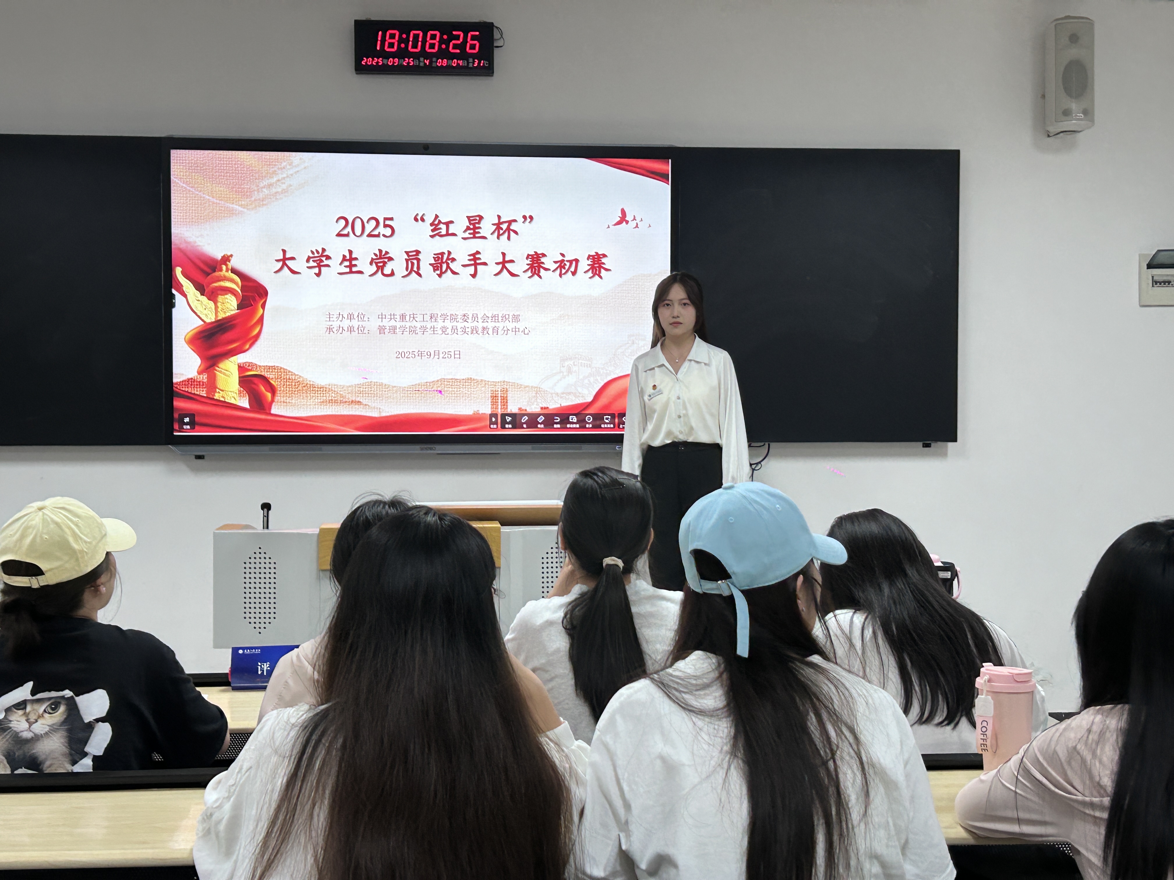 本网讯(图/李佳欣 文/白丹 学生党教中心)为深入传承红色基因,弘扬以爱国主义为核心的伟大民族精神,着力培养大学生党员的爱国主义情感。数字经济与管理学院学生党员实践教育中心于9月25日在第六教学楼举办2025年“红星杯”大学生党员歌手大赛初赛。此次比赛由本学院学生党员实践教育分中心办培训实践部干事冉紫燕主持。