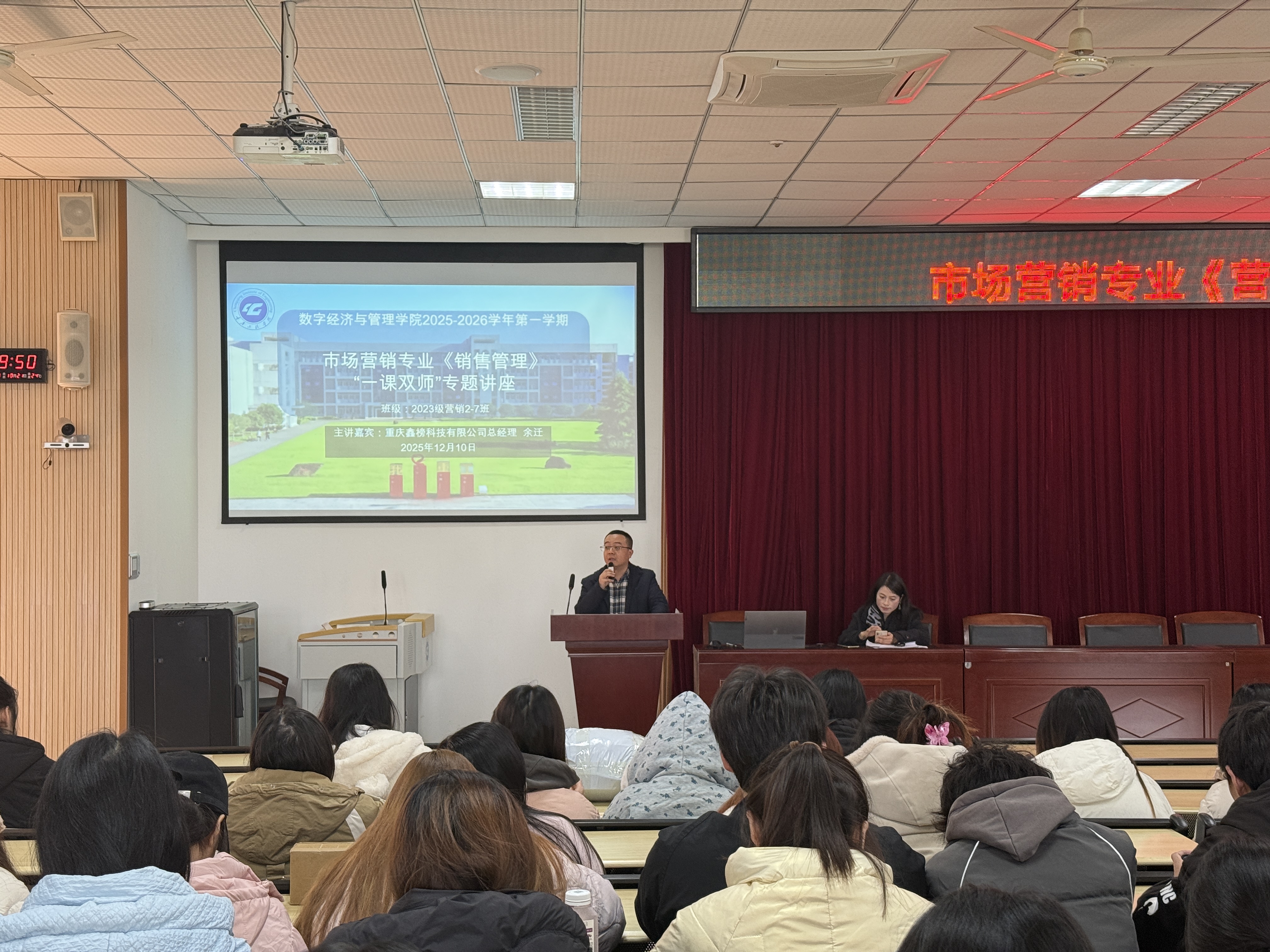 本网讯(文/图 王渝)2025年12月10日下午,我院在6302报告厅举办了市场营销专业《销售管理》一课双师专题讲座。本次讲座特邀重庆鑫榜科技有限公司总经理余迁担任主讲人,市场营销专业2023级全体学生参加。数字营销系教师、《销售管理》课程负责人王渝博士出席并致欢迎辞。