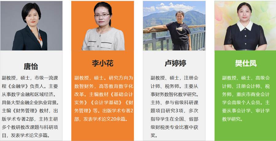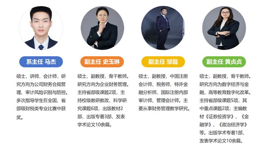 数字经济与管理学院财务管理专业深耕学科建设与人才培养,汇聚了一批深耕财务管理、会计、金融领域,兼具理论素养与实践经验的专业学者,依托数字经济发展浪潮,形成了一支职称结构均衡、年龄梯队合理、富有奉献精神与创新意识,且兼具教学、科研与实践指导能力的高素质学术团队。现有专任教师19人,其中教授1人,副教授8人,博士2人,师资队伍建设成效显著,“双师型”教师占比高达90%,多数教师拥有注册会计师、税务师、高级会计师等行业执业资格,具备丰富的企业财务实操与行业实践经验,能够精准衔接理论教学与岗位需求,助力学生提升实践素养。