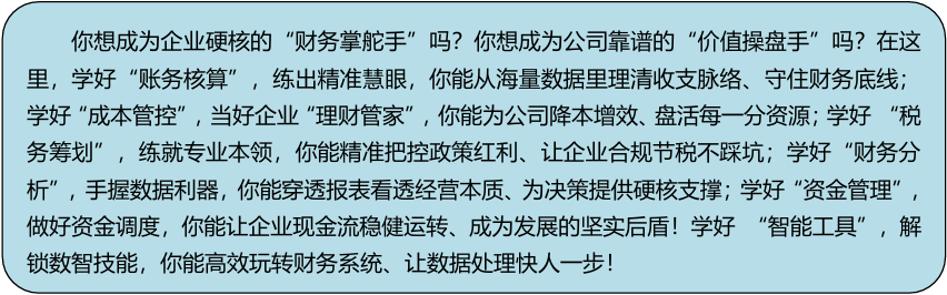 3.课证融通:课证融通人才培养模式,帮助学生在校期间考取初级会计师、初级审计师等证书。同时设立注册会计师方向班,聚焦注册会计师核心考点与行业实战能力培养,通过定制化课程体系、阶梯式备考规划、名师专项辅导与全真模拟实训,搭建从初级证书到高端执业资格的进阶通道,助力学生夯实专业基础、明晰职业路径,培养兼具证书竞争力与岗位适配力的高素质财会人才。