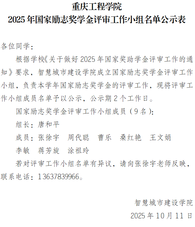 重庆工程学院2025年国家励志奖学金评审工作小组名单公示表