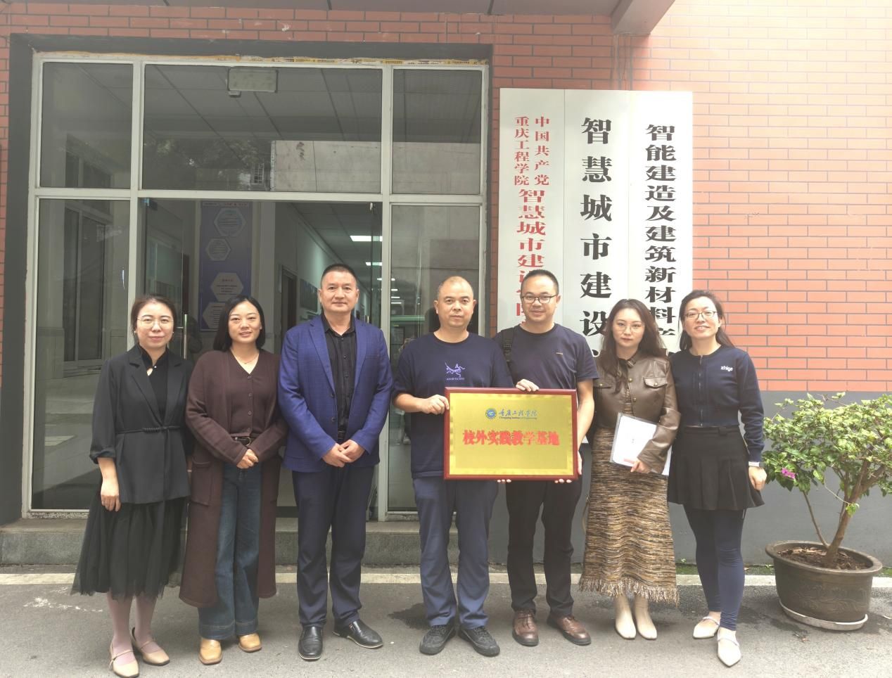 交流会后,双方正式签订校企合作战略合作协议,王强副院长代表学校为一可公司授予 “实践教学基地” 牌匾。双方均表示,将秉持 “互利双赢” 原则与共同发展理念,在项目协同、资源共建共享等方面深挖潜力,推动合作不断深化、取得实效。仪式结束后,全体参会人员在智慧城市建设学院门口合影留念。