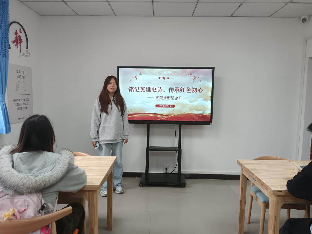 本网讯(文 余鹏锐/图 卢晓燕) 为深化学生党员对抗美援朝历史的认知,传承 “保家卫国、忠诚担当” 的英雄精神,10 月 24 日,智慧城市建设学院学生党员实践教育中心在和五工作站开展 “铭记英雄史诗,传承红色初心” 抗美援朝纪念日主题活动。