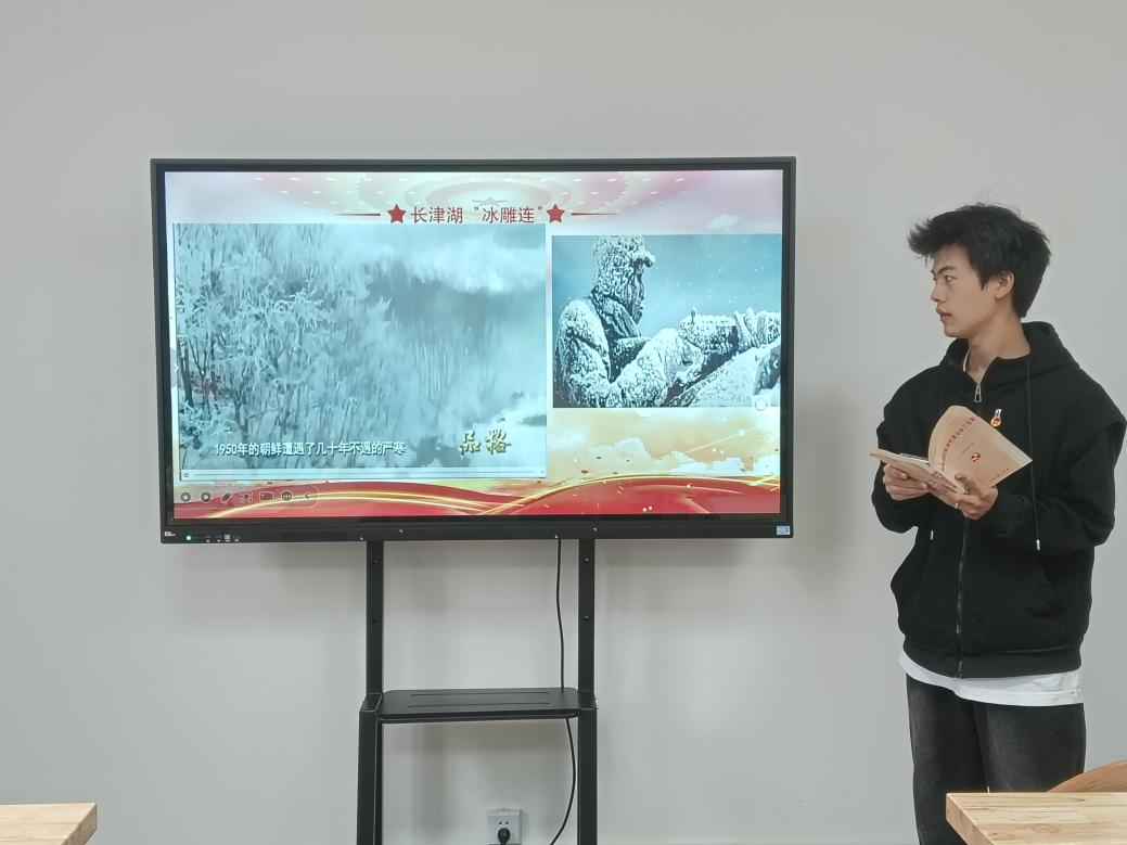 活动伊始,主持人以生动鲜活的讲述串联起抗美援朝历史脉络,同时向现场学生党员展示多组珍贵历史照片与短视频片段。一张张定格历史瞬间的照片、一段段还原英雄岁月的视频,让原本抽象的历史变得直观可感。在场学生党员全程屏息聆听,透过画面中的细节,深刻感受战争年代的残酷与志愿军英雄的无畏,进一步明晰了“抗美援朝、保家卫国”的历史背景,读懂了英雄精神背后的核心内核。