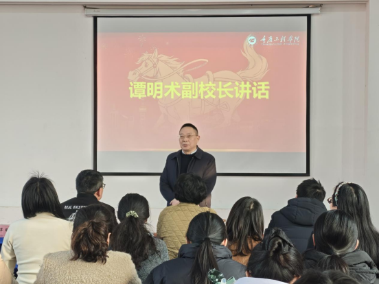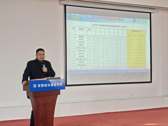 本网讯(文/图 吴俊峰) 为深入贯彻落实“两融一改”工作要求,持续强化内涵建设与内涵发展,积极推动转型发展,智慧城市建设学院于1月15日在学院多功能厅组织全体教职工召开教学反思暨总结表彰大会,谭明术副校长应邀出席会议。