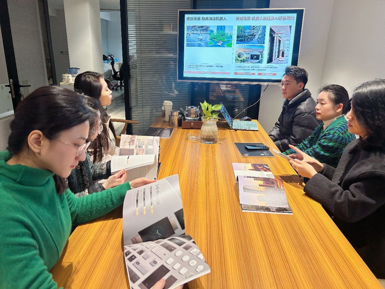 交流会伊始,重庆星网天合智能科技有限公司负责人对校方一行表示热烈欢迎,详细介绍了企业在智能科技领域的发展历程、核心技术、典型案例及战略布局。技术团队重点演示了自主研发的智慧设计成果,涵盖智慧建筑、智慧物业、智能家具、智慧社区等多元应用场景:智慧建筑中,三维可视化建模与物联网传感器实时联动,实现能耗监测、空间分析与环境调节一体化;智慧物业板块,基于AI算法的设备故障预警系统可预判设施隐患并生成维护方案;智能家具环节,具备语音交互、环境感知功能的智能柜体,能精准匹配用户习惯优化生活场景。直观的技术演示不仅展现了“设计+科技”的行业趋势,更让校方明确了学生需掌握的跨学科就业技能方向。