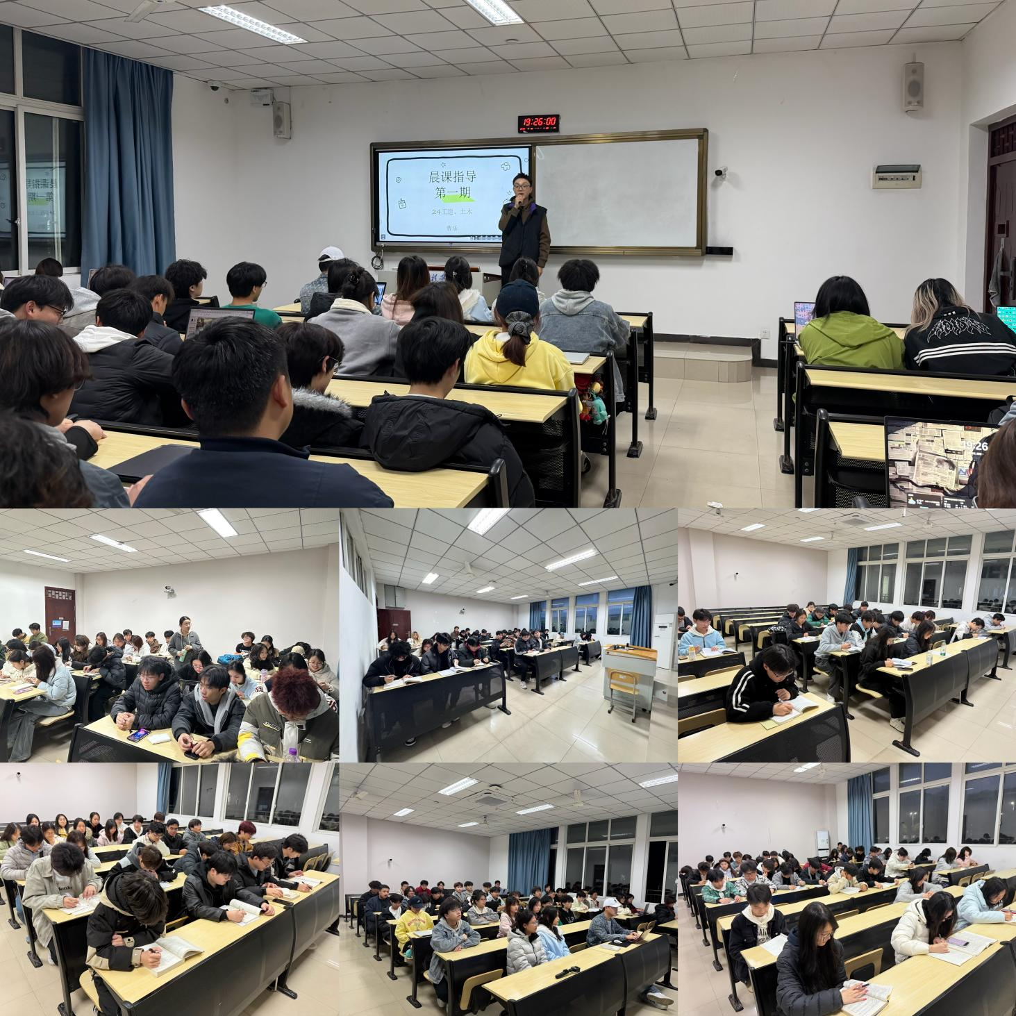 值得一提的是,学院特别安排了一间晚自习教室作为“晨课准备专用教室”,由辅导员老师现场指导同学们准备第二天的晨课内容。老师们耐心解答同学们在演讲准备、内容设计等方面的问题,帮助大家打磨讲稿、提升表达自信。师生互动频繁,教室内不时传出热烈的讨论声,为静谧的夜晚增添了别样的活力。