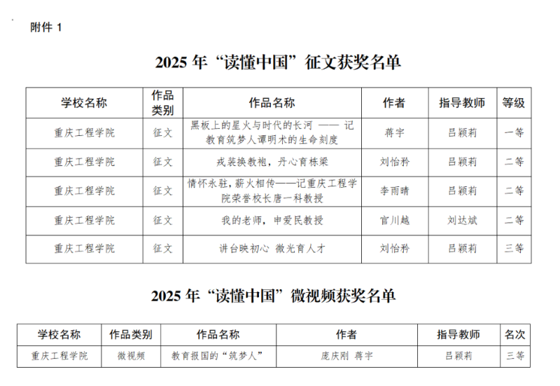 近期,渝教关办发〔202519号文公布了2025年全市“读懂中国”活动获奖名单,我校上报的5篇征文作品、1部微视频作品全部获奖。其中,征文获一等奖1篇,二等奖3篇,三等奖1篇;微视频作品获三等奖。