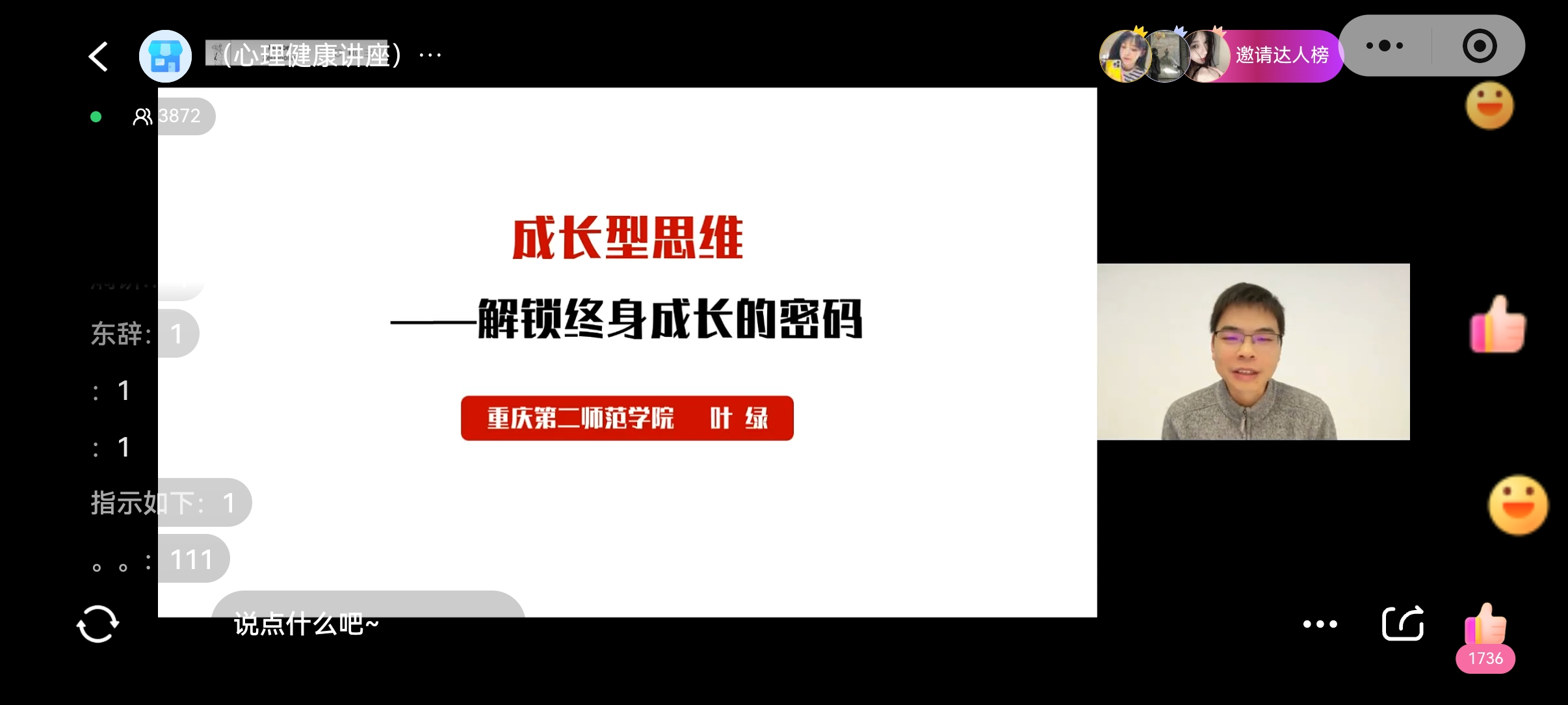 20251128日晚19:00-20:30,由心理健康教育与咨询中心主办的“成长型思维——解锁终身成长的密码”主题讲座通过小鹅通平台顺利在线举行。本次讲座特邀高校心理健康教师、国家二级心理咨询师叶绿担任主讲,旨在引导学生突破思维限制,掌握持续成长的密码,吸引了众多学生线上参与。