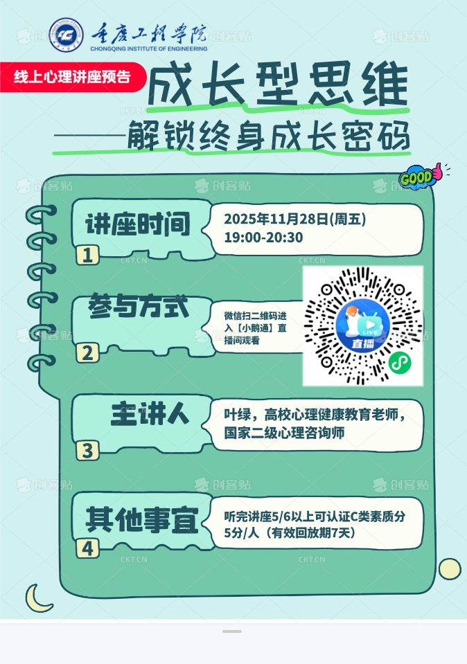 整场讲座内容充实,逻辑清晰,有效帮助同学们认识到能力可通过努力不断发展的理念,为应对未来学习与生活中的挑战提供了积极的心理支持与行动指引。讲座回放将持续开放7天,供同学复习巩固。