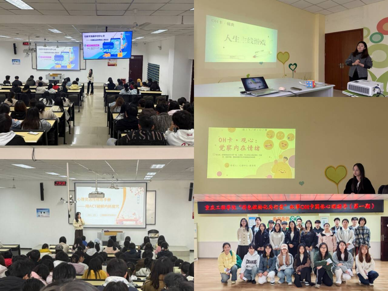 同时,6位心理老师积极响应“双十”活动号召,充分发挥引领作用,持续开展一系列心理主题讲座、团体辅导等深度介入活动。目前张琼老师开展了“将包袱转化为行囊”(第一期)叙事疗法OH卡团体心理辅导活动;牛漫、王姣、章淇莉三位老师也利用OH卡牌开展了“人生主线游戏、探索人际逻辑、觉察内在情绪”系列团辅活动。章淇莉老师举办了“在数字浪潮中守护心灵——构建健康的网络心理生态”主题心理讲座;王姣老师举办了“心理灵活性修炼手册——用ACT破解内耗魔咒”主题心理讲座。其余老师的讲座与沙龙活动持续进行中。老师们将心理健康知识从课堂延伸到课外,从群体覆盖精准到个体关怀。通过专题讲座为学生解析常见心理困扰的深层机制,在团体辅导中创设安全、支持性的环境,引导学生在互动中觉察自我、学习沟通、获得成长。