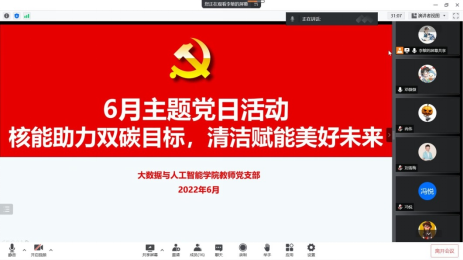 本网讯(图 /廖华)为深入贯彻学习习近平总书记关于生态文明思想的重要指示精神,引导全体党员同志学习“碳达峰”“碳中和”理念,践行绿色低碳的生活方式,6月26日13:00,大数据学院教师党支部在腾讯会议线开展以“核能助力双碳目标,清洁赋能美好未来”为主题的党日活动
