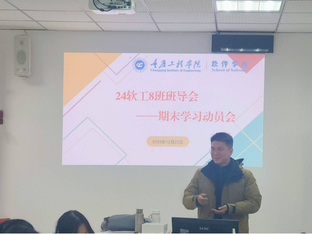 (文/图 软件学院 骆潇)12月23日,24软件工程8班于第四教学楼411召开期末学习动员会主题班会,班导师葛亮围绕实训安排、期末复习、专业发展等核心内容,为同学们明确期末复习要求以及引导同学们规划学业路径。