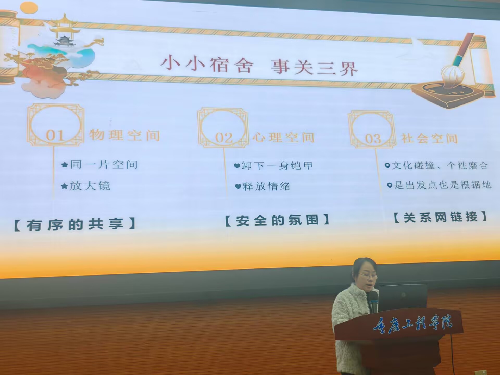 会议伊始,心理中心郭晓伟以“寝室长修炼手册”为主题,围绕寝室物理、心理、社会三重空间,系统讲解了寝室长的角色定位与实操要点。他指出,寝室长不仅是寝室日常事务的组织者,更是室友心理健康的守护者与寝室氛围的建设者,需以暖心行动凝聚室友,携手共建寝室“心灵桃源”。