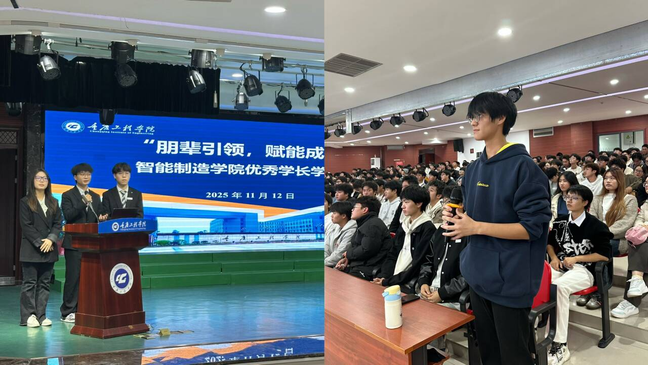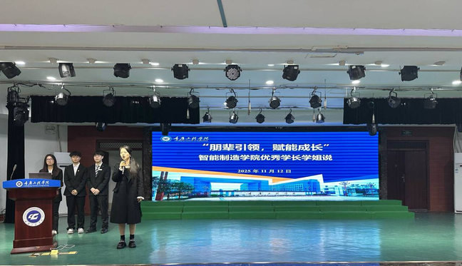 为充分发挥优秀学生的榜样示范作用,帮助2025级学生更好地适应大学生活、明确学业规划、激发成长动力,智能制造学院于11月13日下午14:00在双桥校区办公楼报告厅隆重举行2025-2026学年第一学期“学长学姐说”朋辈教育分享交流会。学院学生科副科长李小凤、2025级全体辅导员、优秀学长学姐蒋文静、刘亚超、赵洪毅以及2025级全体学生参与交流会,学院分团委副书记杨懿老师主持会议。