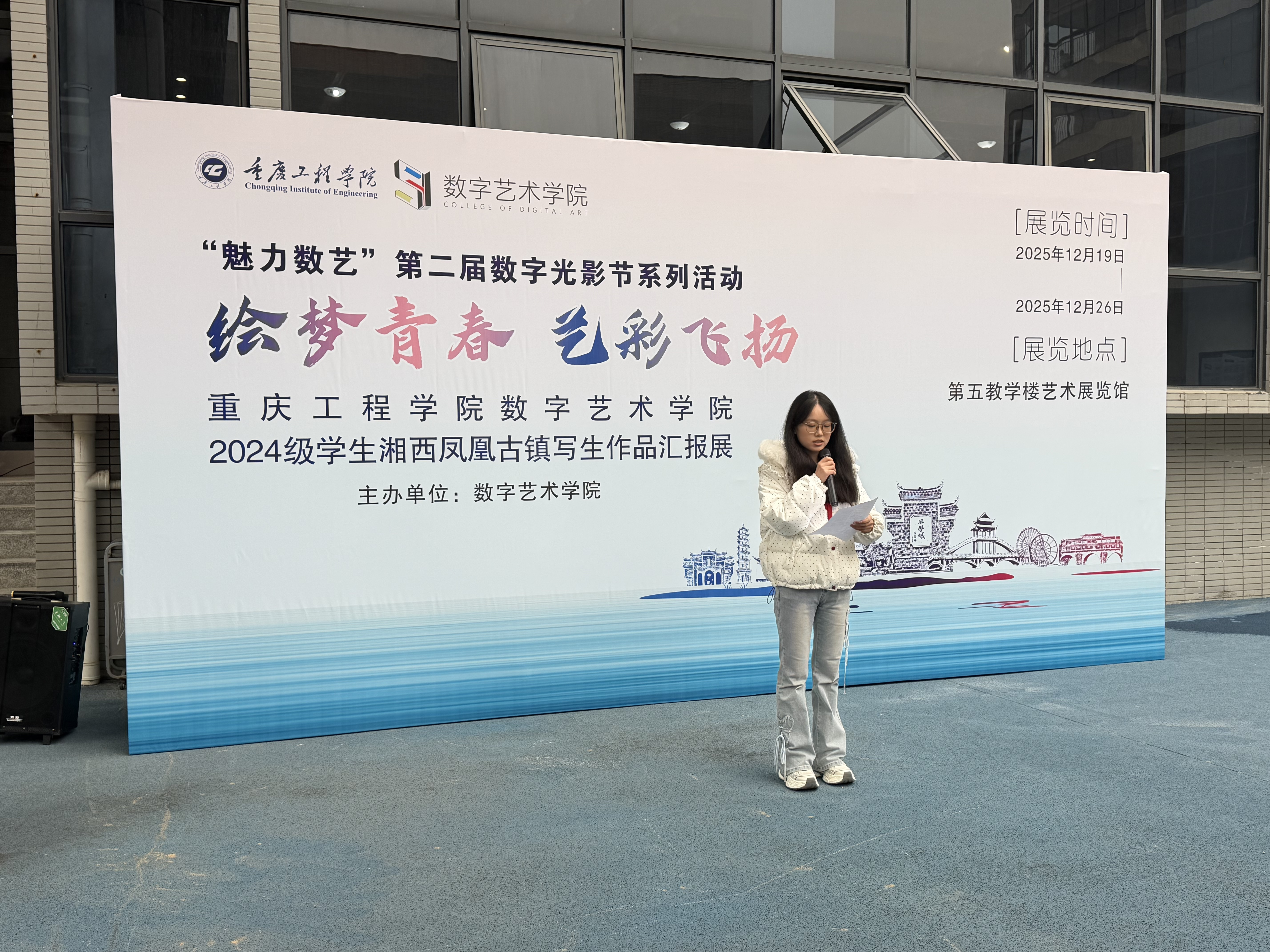 本网讯(文/图 赵正伟12 19 日下午,绘梦青春艺彩飞扬2024 级学生湘西凤凰古镇写生作品汇报展开幕式在第五教学楼艺术展览馆顺利举行。开幕式由学院副院长弋玮玮主持,全院师生积极参加本次活动