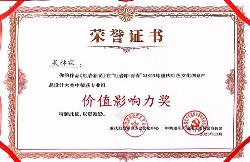 我院设计系教师吴林霖的设计作品《红岩新苗》以独具匠心的设计语言,生动诠释了红岩精神的时代内涵,体现了对红色文化的深刻理解与当代设计表达的积极探索。历经层层遴选,成功晋级专业组决赛,并最终荣获大赛“影响力奖”。这一成果不仅是对教师个人专业素养与创作实力的有力证明,也充分展现了学院在主题性艺术创作与设计应用领域的扎实教学成效。